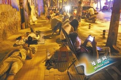 17日21:37,郑州市聚源路小学门前向南的队伍已快排到商鼎路。有凉席、有躺椅、有小板凳、有方桌,还有帐篷……借着微弱的路灯,学生家长赵娟(化名)把塑料凳放在队尾,转身走向门口人群集中处。