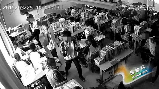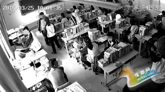 监控显示,一名同学用脚踢座位上的小姜。(视频截图)