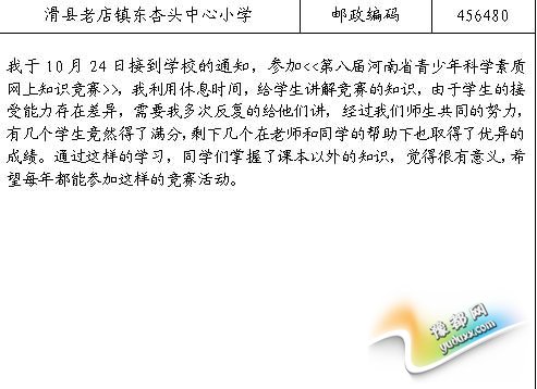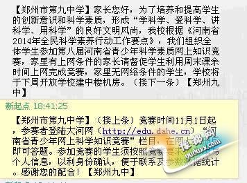 郑州市第九中学利用双休日通过“校信通”向学生和家长发送参赛信息,组织学生参赛,呼吁家长辅导督促学生参赛,并有计划在学校开放计算机教室,便于学生网上参赛答题。