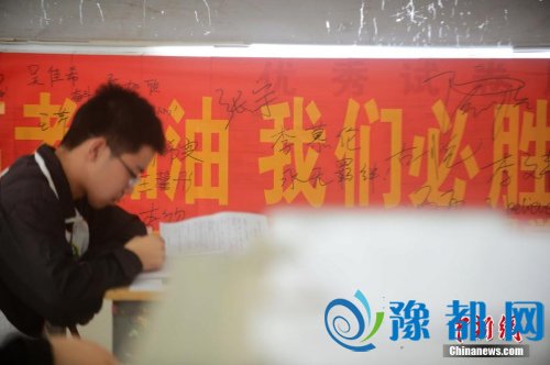 资料图:5月25日,江苏扬州一所中学迎高考,校园内挂满了正能量励志横幅标语。孟德龙 摄