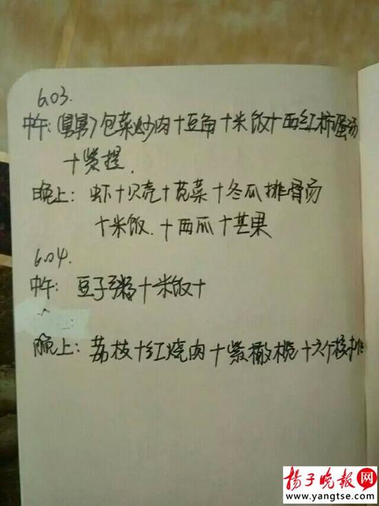 记者了解到,“食谱日记”整组照片共11张,每张照片上的内容都是小林同学在高三母亲送餐后手写记录的,记录分为中餐和晚餐,包括菜、饭和水果等不同种类。