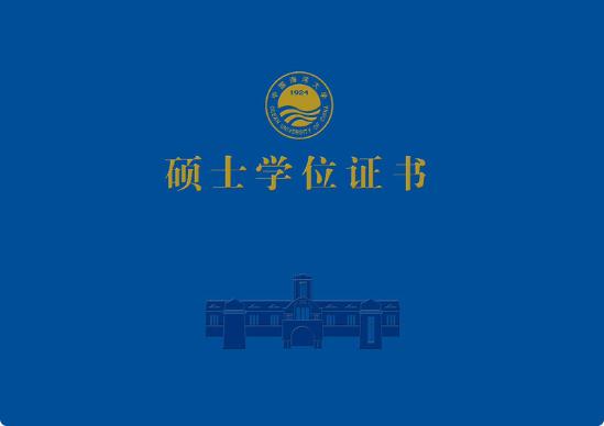 中国海洋大学。学位证书封套选用磨砂亚光PU皮料,博士、硕士、学士分别采用红色、蓝色和绿色加以区分。下方鱼山校区校门和“六二楼”皆为深色凹印,整体风格稳重大气。