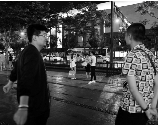 7月14日晚,“小眼镜”咬牙花了1000多元,从鞋子到帽子,焕然一新,他想看看这身新行头有没有效果。第一次搭讪失败。第二次,昏暗的灯光下,看到两个妹子坐在20米开外,“小眼镜”走上前搭讪:“你好,我是来这边玩的,觉得你很特别,想认识你一下。”结果对方被逗乐了。“小眼镜”有些灰心,导师给他鼓劲,有进步,至少没把人吓跑。