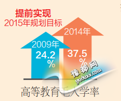 截至2014年底,我国高等教育毛入学率达到37.5%,在校生规模达到3559万人,居世界第一,提前完成预定的阶段目标。