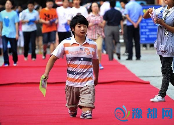 2011年6月7日,在陕西汉阴县中学考点门口聚集了千余名高考生,监考老师一声哨响,校门打开,考生陆续踏上学校特意铺设的红地毯。在他们当中,一个只有1.2米高的考生引人注目,他叫李卫,穿着鞋子却没有脚,凭着我们难以想象的毅力,跪行走入考场。