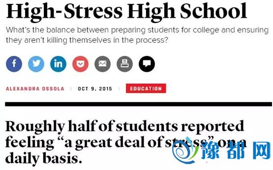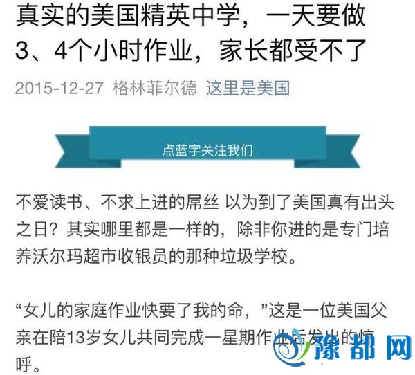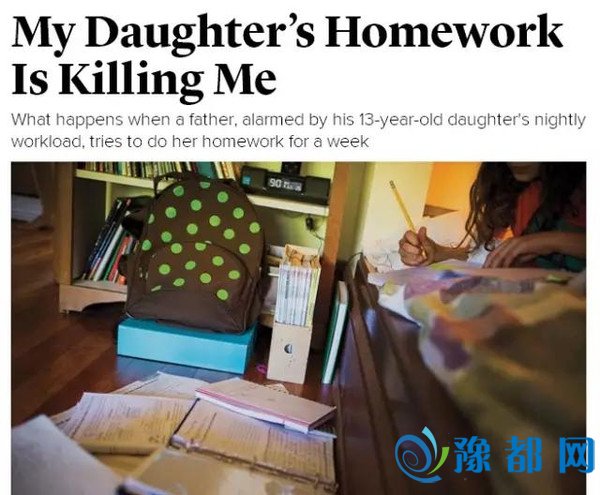▲相关报道截图然而,走入精英私立中学,还仅仅是这些孩子成功的第一步。因为他们还要面临大量的作业!有调查就显示,这些私立高中的学生,有一半的人常年生活在沉重的学业压力下,他们通常会做作业做到凌晨1点,然后早上6点就要起床去上学… 而我们报纸旗下的@这里是美国 帐号,前天则刊登了另一篇来自《大西洋月刊》的文章。文章的作者直接表示他已经快被自己13岁的女儿的作业弄崩溃了。因为他无法理解才13岁的她为啥要在中学学习高深的地球科学,而且每天放学后还要花多达5小时的时间写作业,内容还包括大量代数题、阅读名家文学并撰写分析….