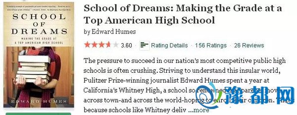 ▲这本名叫《梦想中的学校》在goodreads.com上的简介。结果他发现这所学校之所以成功,恰恰在于这所学校采取了大量与我们中国的高中十分相近的管理办法。比如分班教学,比如大量的课本和作业,甚至于学生们一天只能睡觉4个小时,只是为了能拿高分! 但望子成龙的家长们并不反对学校这么做,而且这些家长本身对子女的教育也非常投入,还会在校外给孩子继续请家教,以确保孩子能够应付频繁的考试和美国“高考”的挑战。