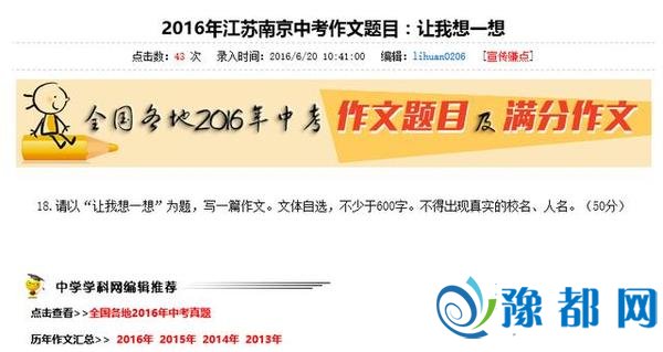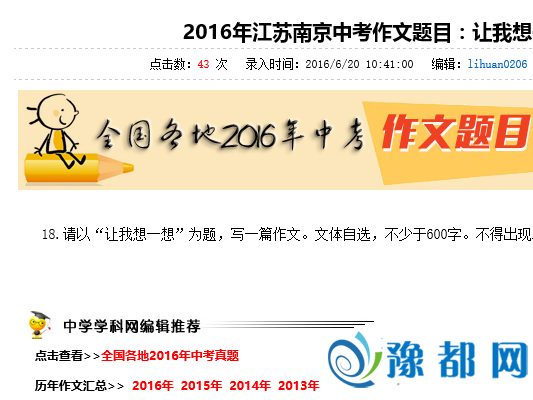 2016年各地中考陆续进行中,学科网正在陆续发布已经结束的地区的中考试题。在众多地区的中考试题里,南昌的一道物理题和南京的语文作文题成功成为2016年已经发布的中考题中的焦点。