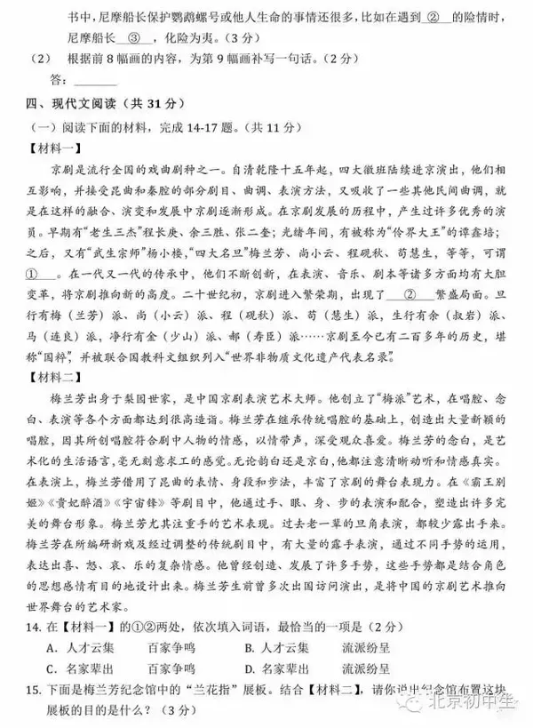 八、强化语文实践多文本阅读试题采用了梅兰芳纪念馆作为素材,体现了语文学习与社会大课堂的相互结合。试题中不但有取自纪念馆的“兰花指”展板,还有梅兰芳演出《霸王别姬》时的手势图片。题目将语文学习与博物馆参观有机整合,体现了对学生语文实践活动的关注,在现实生活中丰富了学生的语文学习。
