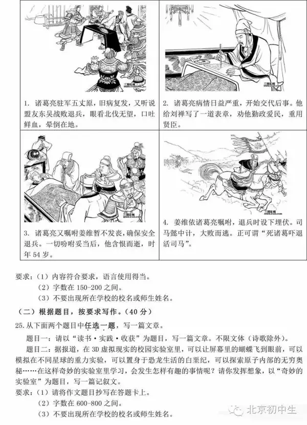 作文题(一)根据情境,按照要求写作。(10分)24.从下面两个题目中任选一题,按照要求写作。题目一:有位外地朋友来北京,想通过品尝北京特色美食体验京味文化。请你写一段话,向他推荐一种具有北京本地特色的美食(如北京烤鸭、涮羊肉、炒肝儿、豆汁儿、驴打滚儿、冰糖葫芦、艾窝窝……)题目二:语文课上,老师组织同学们讨论《三国演义》中诸葛亮这个人物形象。你的任务是阅读下面连环画,就印象或感受最深的一点,写一段点评(可以点评诸葛亮的精神境界,也可以点评他的所作所为),准备发言。