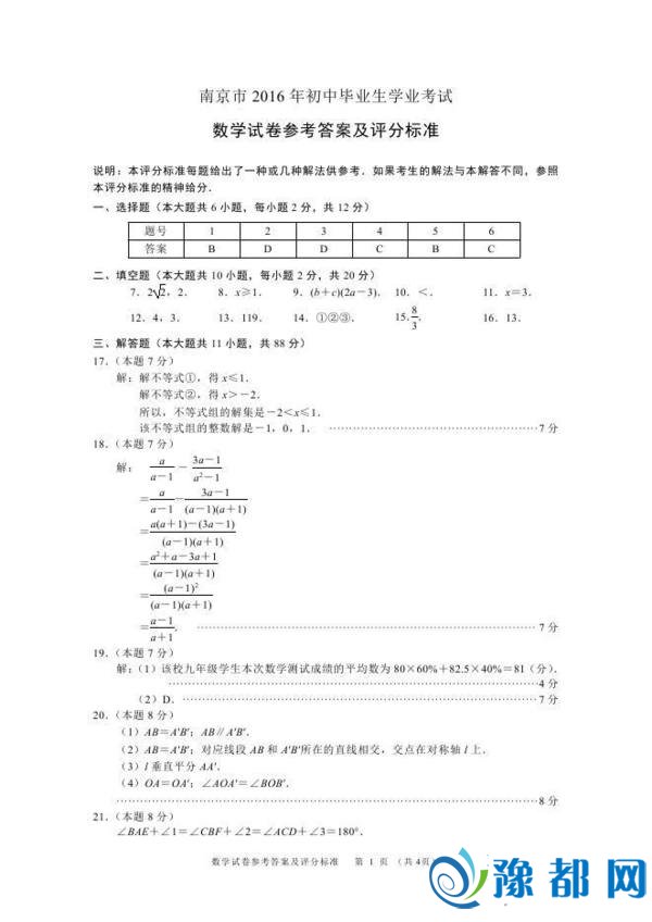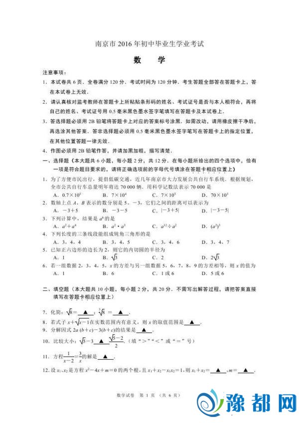 《2016中考 南京数学试题及参考答案》由河南新闻网-豫都网提供,转载请注明出处:http://edu.yuduxx.com/sxks/zk/444490.html,谢谢合作!