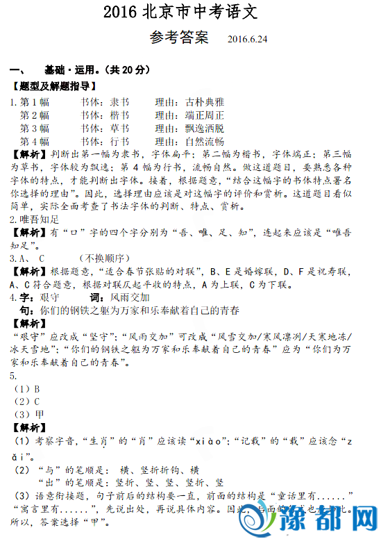 《2016北京中考语文试题答案公布啦》由河南新闻网-豫都网提供,转载请注明出处:http://edu.yuduxx.com/sxks/zk/444491.html,谢谢合作!